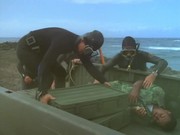 At the beginning of the show, a helicopter delivers "new and highly sophisticated" explosives to a Marine demolition team at some isolated testing ground near the ocean. After the helicopter leaves, a group of Roarke's associates, who are wearing wet suits and face masks and are approaching from the sea below, throw canisters of knock-out gas at the soldiers who faint dead away in a phony manner. When the bad guys climb up to grab the goods, they aren't wearing any gas masks! The helicopter actually flew right over them hiding below behind rocks with their rubber dinghy, but somehow the people in the copter did not see them or the other boat which arrived shortly after to take the stolen explosives and tow the dinghy and the four frogmen away, duh! (Thanks to Jeff.)