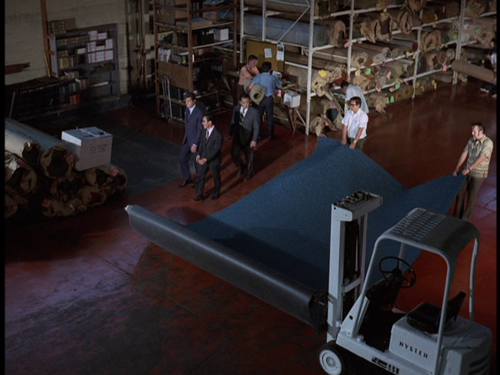 Walter works at a carpet store which is located next to a bank where people have tunnelled through to the vault and ripped off the cash. He is obviously a "valued employee" because he and three others set up a scam where the cops and Five-O follow a truck which they think has the money, but it doesn't have it. These four then attempt to flee with the cash, but they are stymied by the cops and Five-O who are wise to their scheme. In addition to the sequences here, Walter, who is wearing a blue shirt, can also be seen working in the carpet store's warehouse earlier in the show (still shot below).