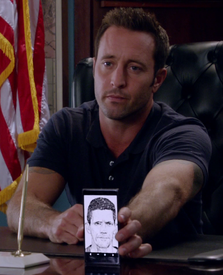 Ignoring questions about whether these devices are available to the general public and whether anyone using them could get access to confidential fingerprint databases, Jerry manages to override the device's searching and instead connects it to bogus identities for McGarrett and Danno. All of which is idiotic, because both McGarrett and Danno have had a very high public profile as crime-fighters for the last six years. HELLO -- I was already bitching about McGarrett's public recognition when he was participating in an MMA fight in the second season, fer chrissakes!