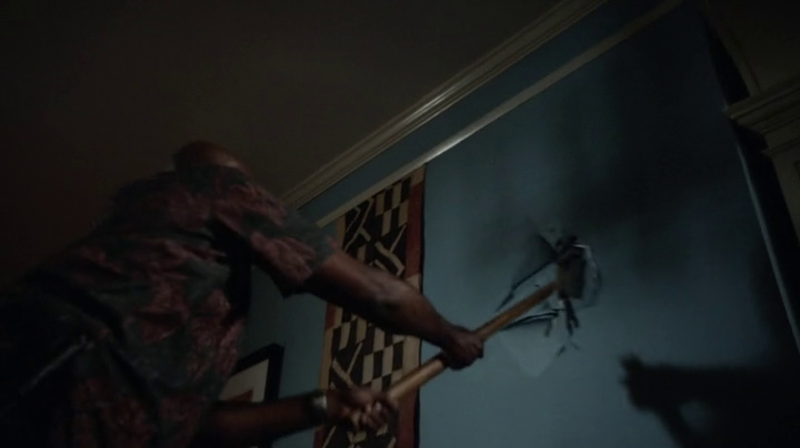 For example, at the beginning of the show, Holm manipulates the automated controls of the home network in the house where Wells is babysitting, causing the temperature to drop. When the baby upstairs starts crying, she leaves her cell phone and goes upstairs where everything is OK. When she returns, the phone isn't where she left it, but it is in a darkened room upstairs next to the baby's room. Somehow Holm managed to get it and sneak it up there without her seeing him.