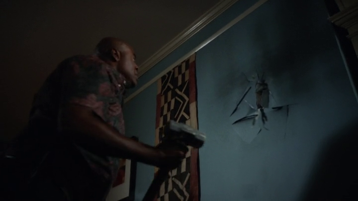Grover and the SWAT team rush to the scene, but drive over some spike strips in the street which the bad guys have conveniently placed there, knowing in advance which streets SWAT will take. (These strips seemingly have explosives in them.) Another massive firefight follows and Grover has his ass saved by Abby, who somehow managed to survive an execution attempt by one of the yakuza thugs who was holding her prisoner back at the meth house.