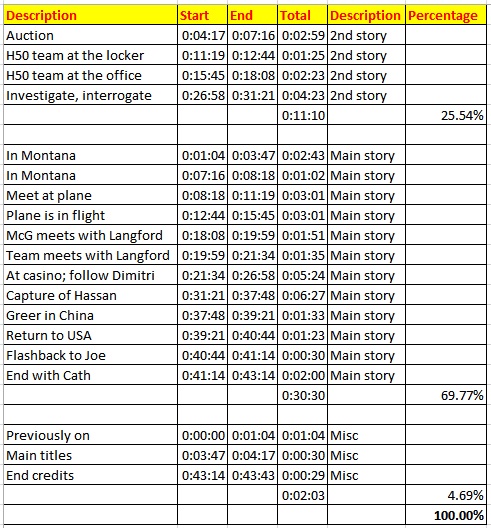 - This episode breaks down as follows: Crime of the Week - 72.87%; Eddie digs, McG and Danno yap at beginning of show - 8.19%; Miscellaneous (credits, previously on) - 4.23%; Tani's problem - 14.70%.