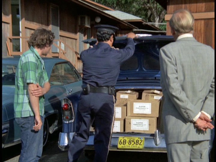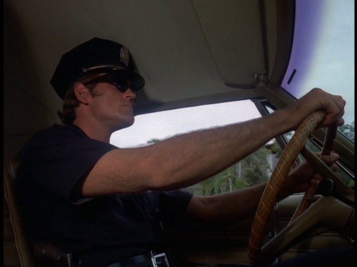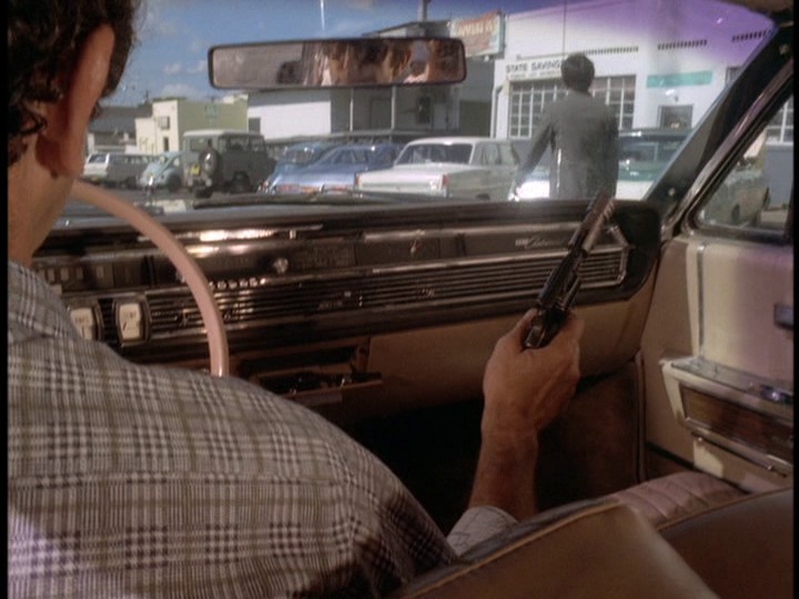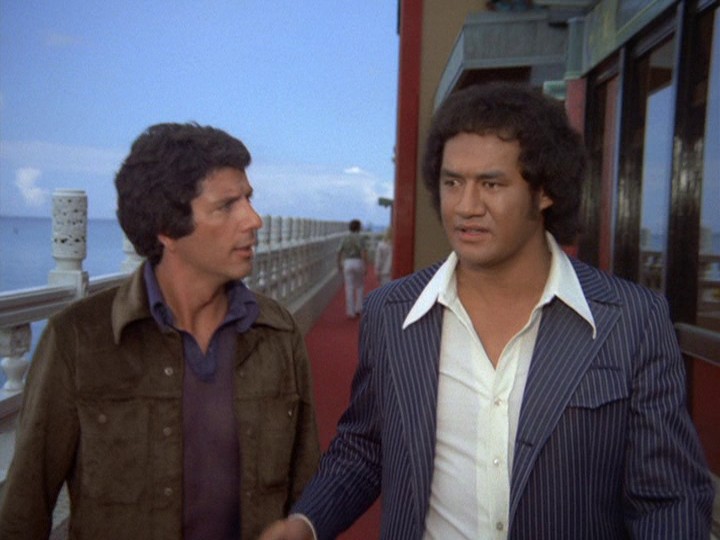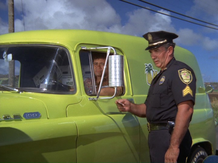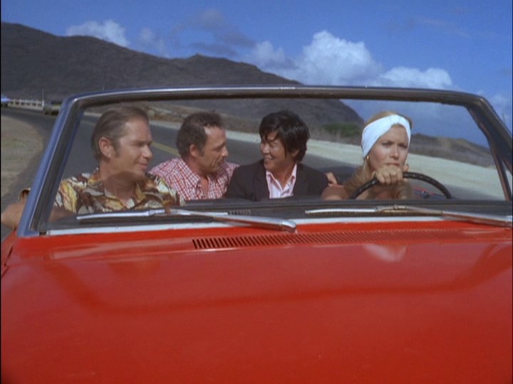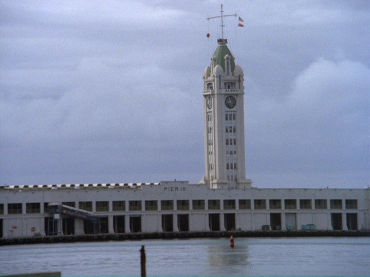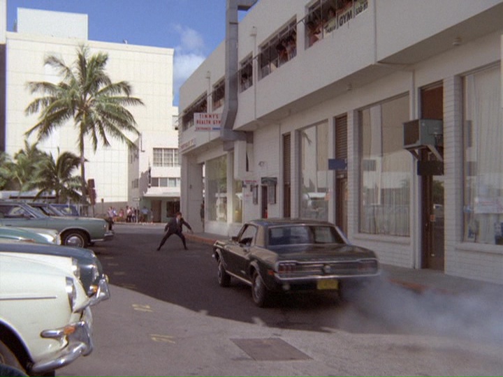 McGarrett and Danno, plus a large number of HPD cops, are alerted to the car involved in the robberies, which heads to the docks where a cruise ship, the S.S. Monterey, is preparing to leave Hawaii. There are numerous stock shots of police cars, and the tires of McGarrett's Park Lane smoke when he turns sharply around a corner.