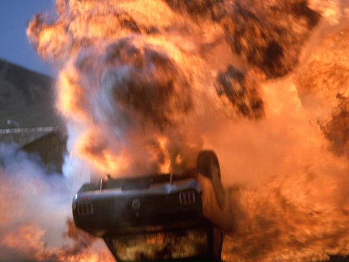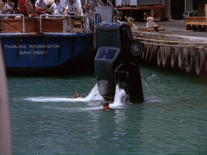 Collectors of classic cars may be upset at seeing Stoner's Mustang being hauled out of the harbor. However, as Carl Walter points out: "The Mustang pulled from the water is a completely different car from the one used in the chase. Stoner drives a 1968 model, and the harbor car is from 1964 or 1965 — similar, but a different design, and likely a cheaper used car to dump in the water from a TV production standpoint."