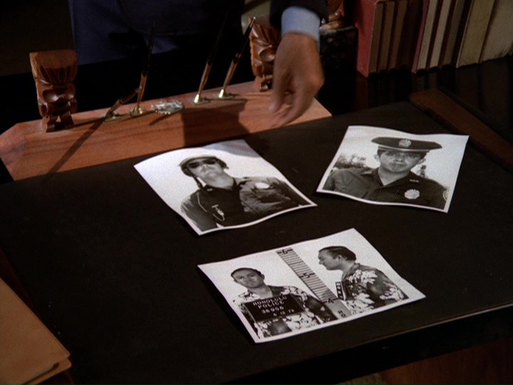 He immediately puts in a call to the one remaining cop from the robbery detail, Larry Thompson. Central Dispatch says Thompson is "off duty," but when Danno appears a minute later, he tells McGarrett that Thompson, who we saw earlier at the McKinney shootout, is dead. It strikes me odd that Central Dispatch would not have known this.