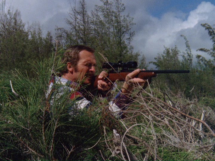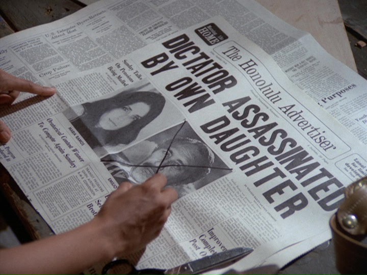 At the beginning of the show, Stoner kills Keoki, one of these four cops, who has part-time work accompanying funerals on Saturdays. Following this, we see Stoner clipping a newspaper headline from the Honolulu Advertiser which identifies him as a "roofstop sniper," and McGarrett later asks "How did the rifle end up on a rooftop?" But Stoner, when he shot Keoki, was actually on top of a hill, close to a cemetery. (The crosshairs of his rifle seem to be everywhere but on the target prior to the shooting.) The date on this newspaper is Tuesday, October 9, 1973 — a month after the show was originally broadcast.