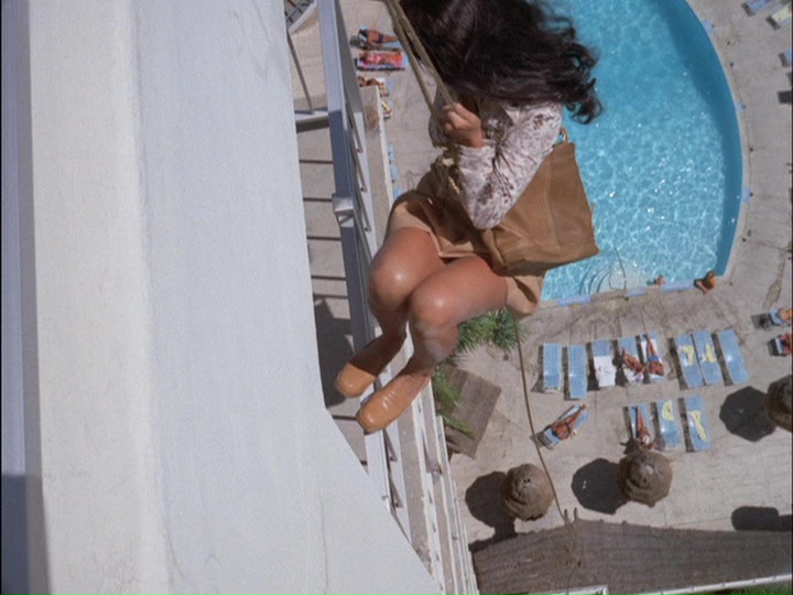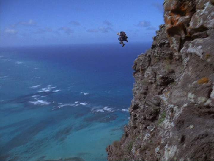 McGarrett comes into the room as if to arrest Bordeaux. But then Bordeaux, having already rigged "some kind of a mountain climbing device" over the balcony (when did he do this?) and despite being about 60 years old, rappels down what is later said to be "20 floors"! Talk about stupid.