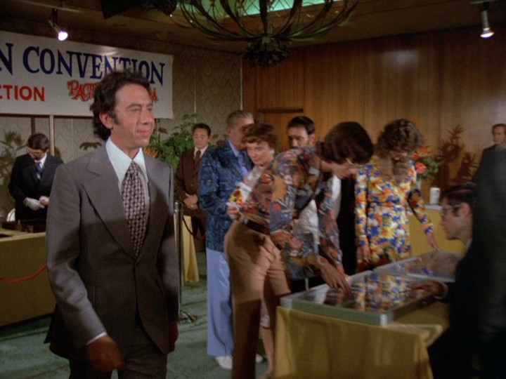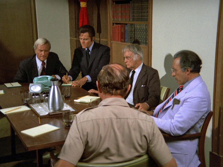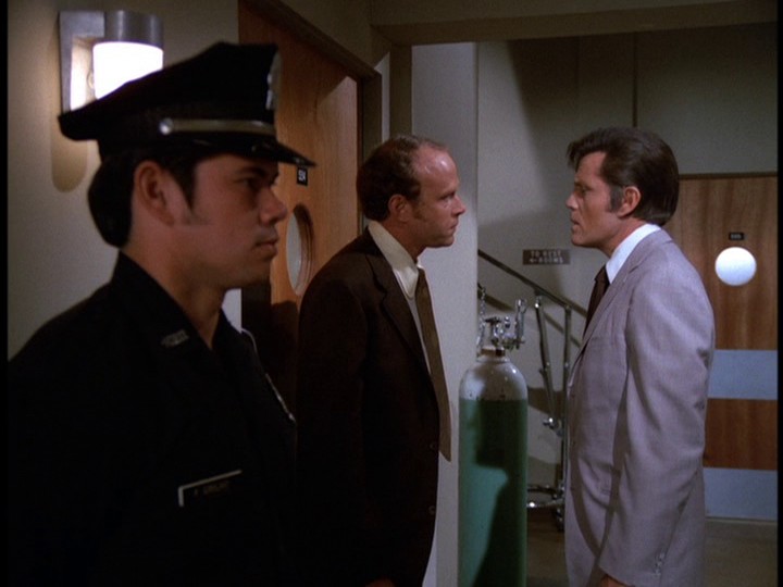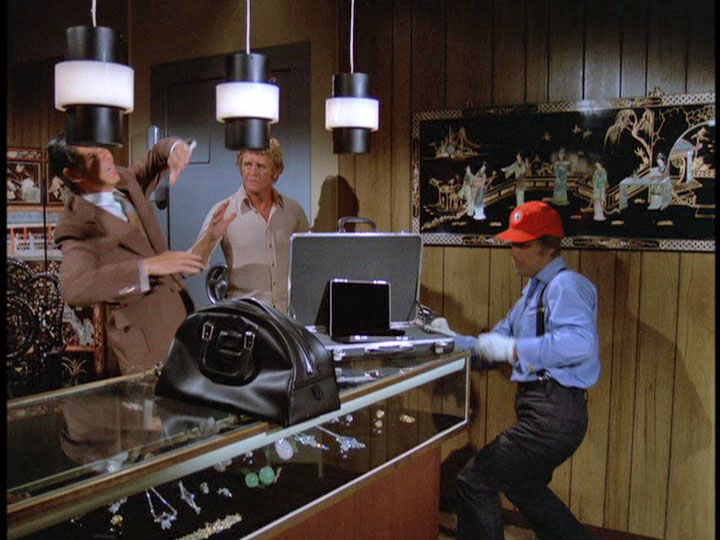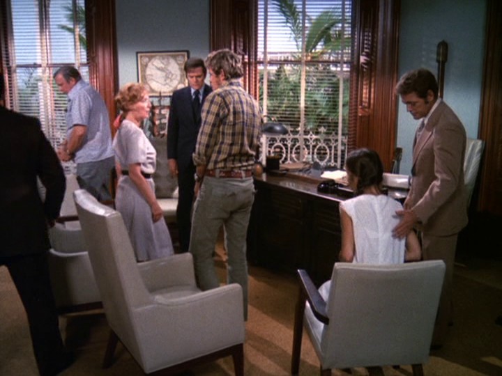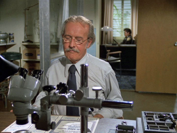 When Five-O goes to talk to Joel Holt (Norman Dupont), manager of the Coral Crown Hotel, about setting up a trap for Bordeaux there, Holt does reveal details about how Mr. and Mrs. Scherzinger (one of the "probables" on Danno's computerized list who are staying at this hotel) won't use the place's safe deposit boxes. Holt also knows that "the latest insurance report [WHAT?] tells us that they're carrying a hundred thousand in jewelry with them."