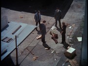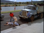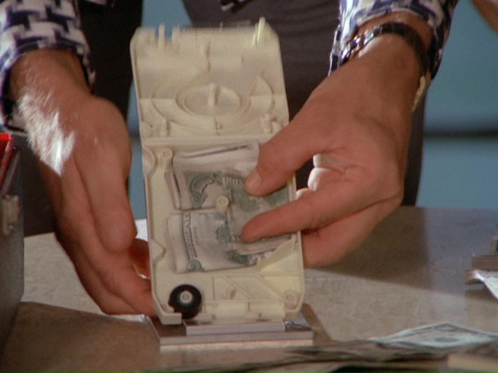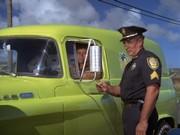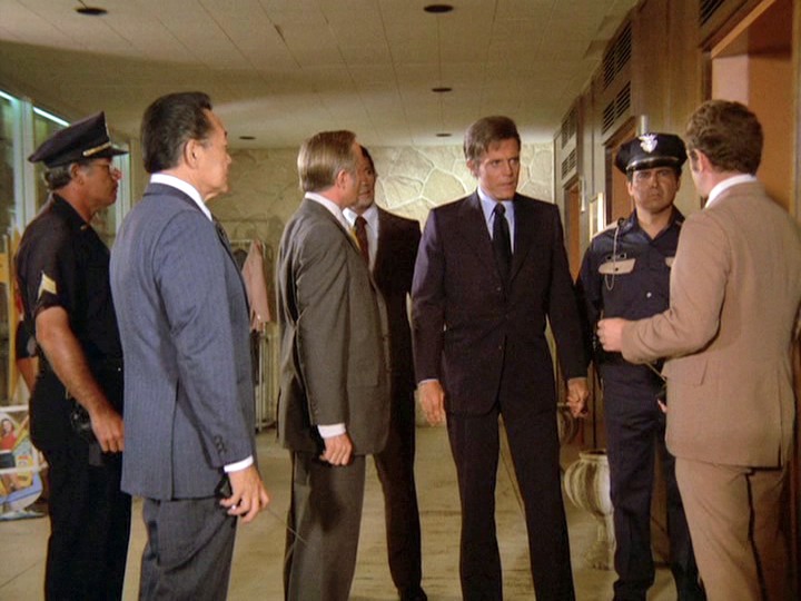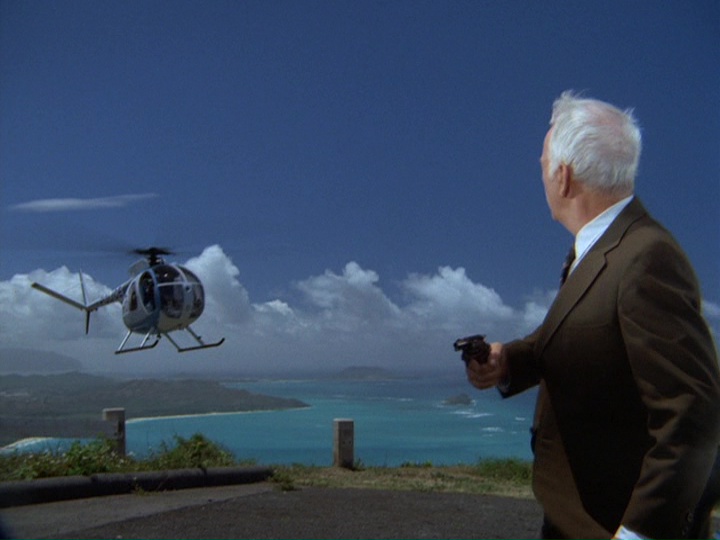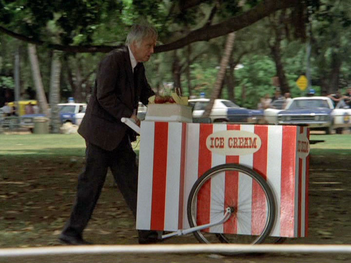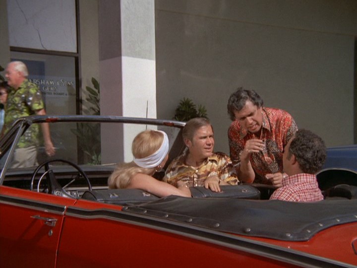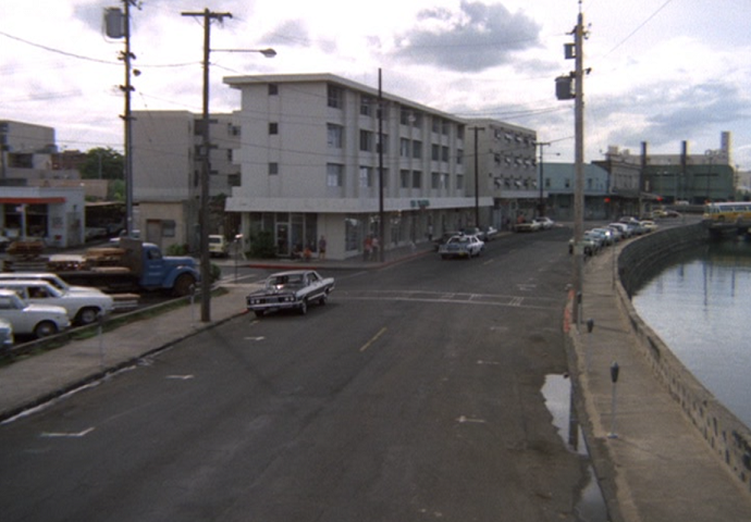 The driver of the robbery car and his large attaché-like case containing the proceeds from the banks vanish onto the ship. McGarrett and Danno arrive, and soon after this, the cops bring Gordon to the docks, saying "We found him near the golf course on Ala Wai [spelled Alauai in the subtitles] Boulevard." IDd as "a hostage in the bank shooting," Gordon tells McGarrett that the "crazy gunman who drove the getaway car" tried to kill him by shooting at him three times before Gordon "jumped out of the car." Gordon says, "I guess he would have kept shooting except the police were on his tail." If this was the case, it seems odd that the police didn't see this happening at the time.