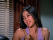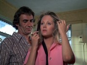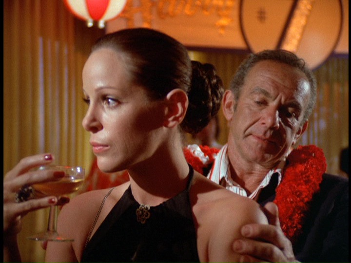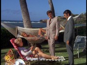 Gail Strickland is Elena Lewis, a feature writer for Transpacific Wire Services. Over the ship-to-shore radio, Chin cautions McGarrett that she is licensed to carry a gun. In the ship's dining room, Lewis sends over a bottle of champagne to McGarrett, telling him, "I like to meet attractive men, and I'm not very good at shuffleboard." He describes this gesture as "a friendly ice-breaker at $14 a throw." When he asks her why she did this, she replies, "We're supposed to be the liberated sex." He says, "No, no, honey, I don't buy it ... with your looks, you don't have to give away bubbly." Yawn! Strickland has a somewhat more substantial part in next season's "How To Steal A Masterpiece."