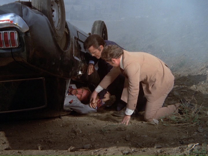 The opening scene from the funeral procession with the casket falling out of the hearse is brilliant. Rod Baker, who co-wrote this episode, e-mailed me years ago: "The director didn't plan that shot. My writing partner, Glen Olson, and I watched the filming of the fish-tailing of the hearse. When they were ready to move to another location, Glen and I looked at each other and said something to the effect of 'why don't they film the coffin pitching out of the hearse.' Luckily, [executive producer] Leonard Freeman was on the set and overheard us. He said it was a great idea and wanted the shot. The director, Allan Reisner, complied and was not upset with our 'meddling'." Stuntman Beau Van Den Ecker is the driver of the hearse.