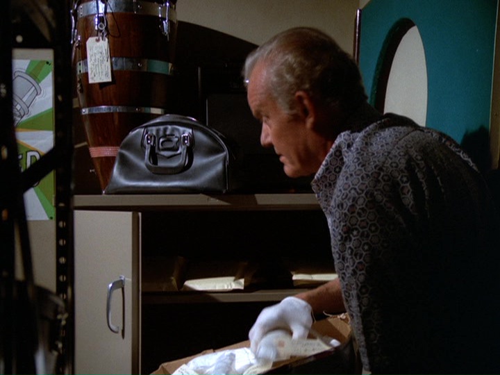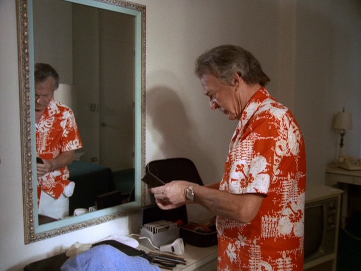 David Wayne plays an elderly (these days "middle-aged") crook named Bordeaux, a.k.a. S.R. Horus, who is a master of disguise, similar to Lewis Avery Filer in S03E11, "Over Fifty? Steal!" and that show's mediocre sequel, S04E14, "Odd Man In." There are numerous parallels to the Filer episodes, especially the music, some of which is reused from the earlier shows along with excerpts from Bruce Broughton's score to S06E11, "The Finishing Touch."
