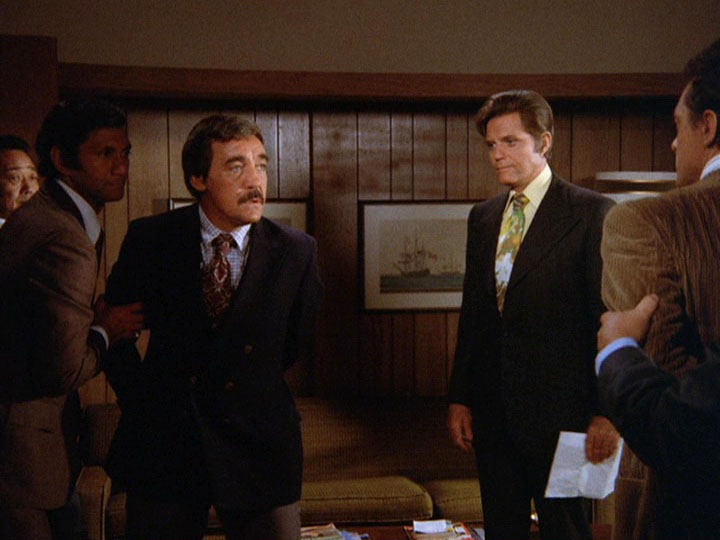 After escaping up a conveyor belt which leads to the docks, Fallon is busted and taken away by the San Francisco cops, but McGarrett turns to another officer and says, "Here's your man," indicating Gordon. Gordon is incredulous at this, but McGarrett tells him, "You and Fallon planned this whole thing. Swindled your clients … this whole phony rip-off. Proceeds to be shared by crook and victim later on. You had me fooled … Fallon was on board, and you refused to identify him. We examined the jacket that you discarded, the one with the bullet crease in it. It had powder burns on it. You told us that the gunman fired at you after you jumped out of the car. [Actually, this is not what Gordon said earlier!!] Now, powder burns are caused by a shot fired at extremely close range. You took your jacket off to do it. Not very smart, Mr. Gordon."