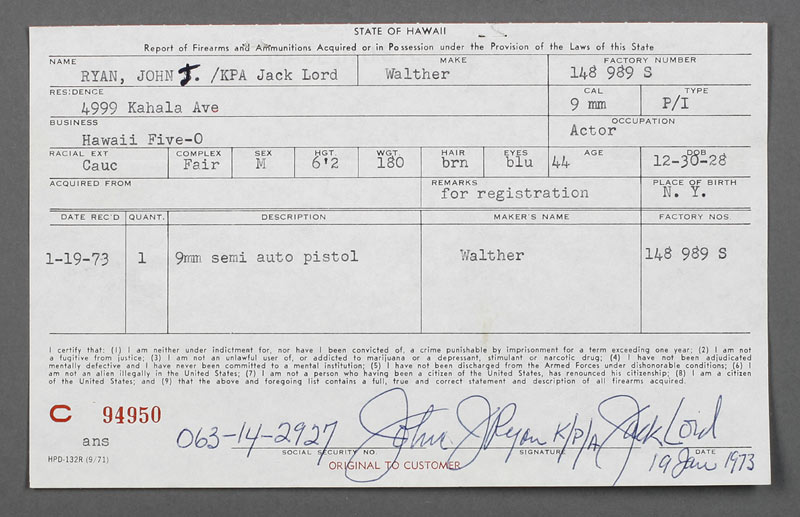 ○ It is said that in the scene near the end of the original show where McGarrett breaks into Stoner's apartment, Jack Lord is carrying a nickel-plated .38 revolver given to him by Elvis Presley. The producers attempted to make this less obvious by spraying the shiny gun with hair spray. Presley gave Lord a gold-plated Walther PPK with ivory grips, not the sub-nosed .38 that McGarrett used in this scene. Here is the originalgun license issued from the state of Hawaii.